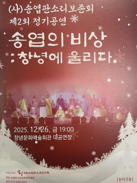 [LBMA STAR]지난 2023년 9월 창립해 그해 12월 창립 및 창녕아리랑 기념공연, 남지유채축제·센다이 교류초청공연, 창녕상공협 초청공연등 활동을 펼쳐 온 (사)송엽판소리 보존회(이사장 지미희)의 제2회 정기공연이 오는 12월 26일 오후 7시, 창녕문화예술회관 대공연장에서 펼쳐진다.   ▲(사)송엽판소리 보존회의 제2회 정기공연을 알리는 포스터...